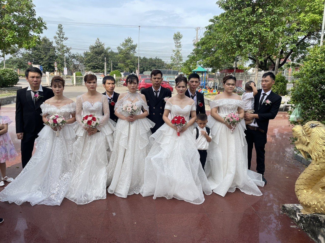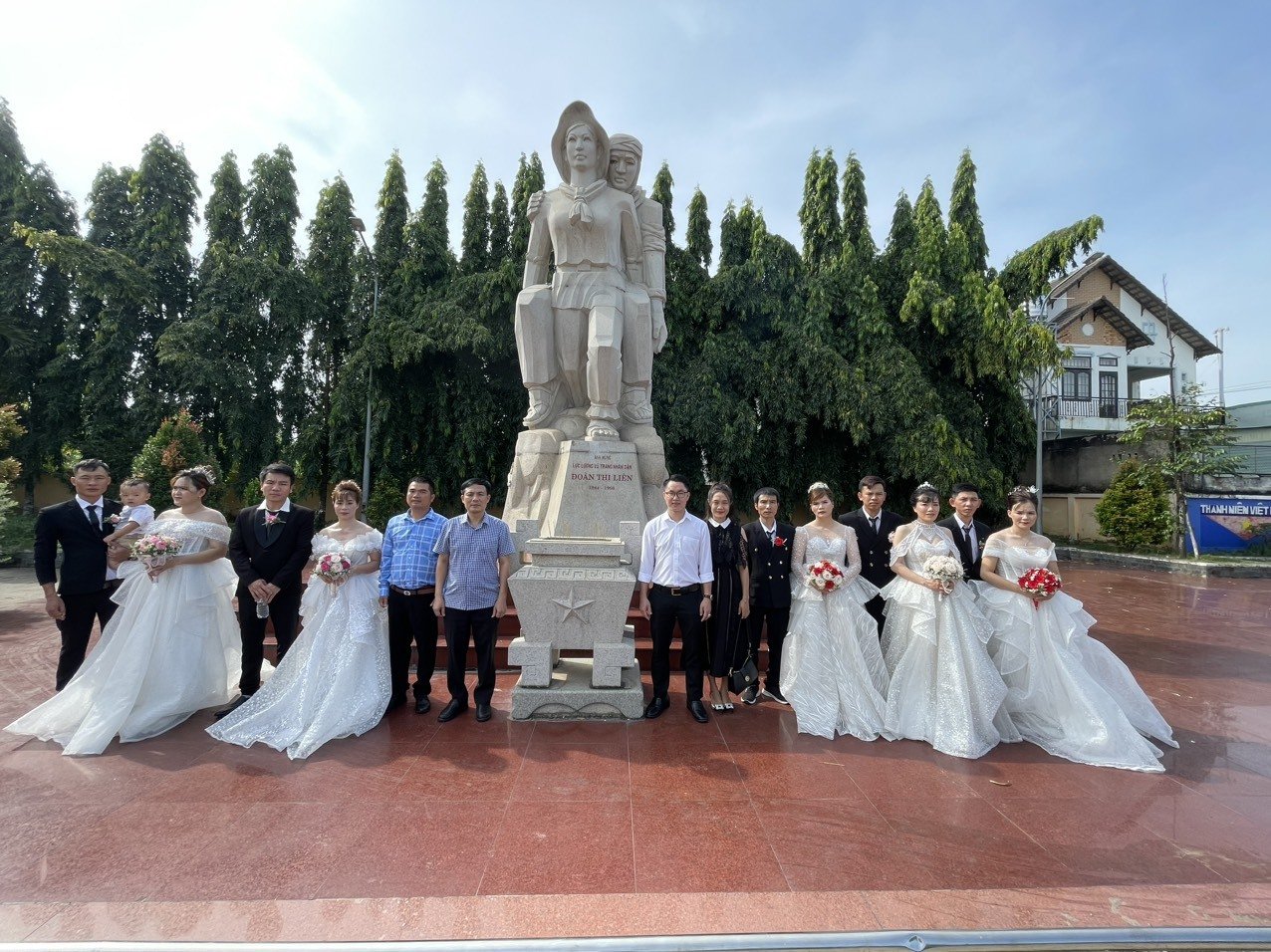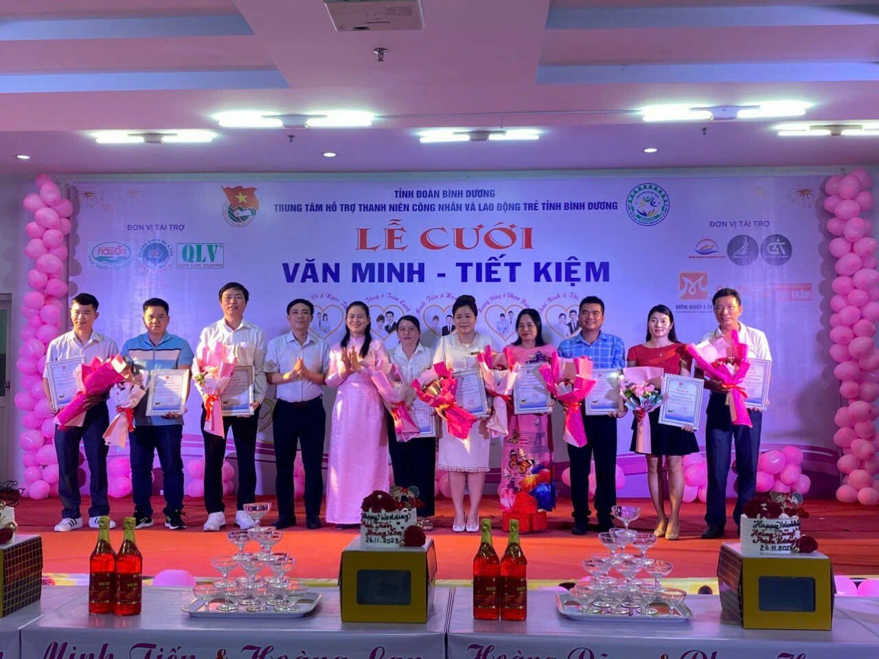 05 cặp đôi tham gia lễ cưới tập thể gồm: cặp đôi Nông Vỹ và Ngọc Thảo, cặp đôi Xuân Thúy và Trần Lanh, cặp đôi Thái Bình và Thị Vinh, cặp đôi Minh Tiến và Hoàng Lan và cặp đôi Hoàng Dũng và Phạm Hương. Tất cả đều là công nhân xa quê đến Bình Dương sinh sống và làm việc. Khi được Trung tâm cùng các doanh nghiệp, đơn vị tổ chức lễ cưới tập thể trong khuôn khổ tiết kiệm, an toàn, họ đều cảm thấy vui tươi, hạnh phúc.