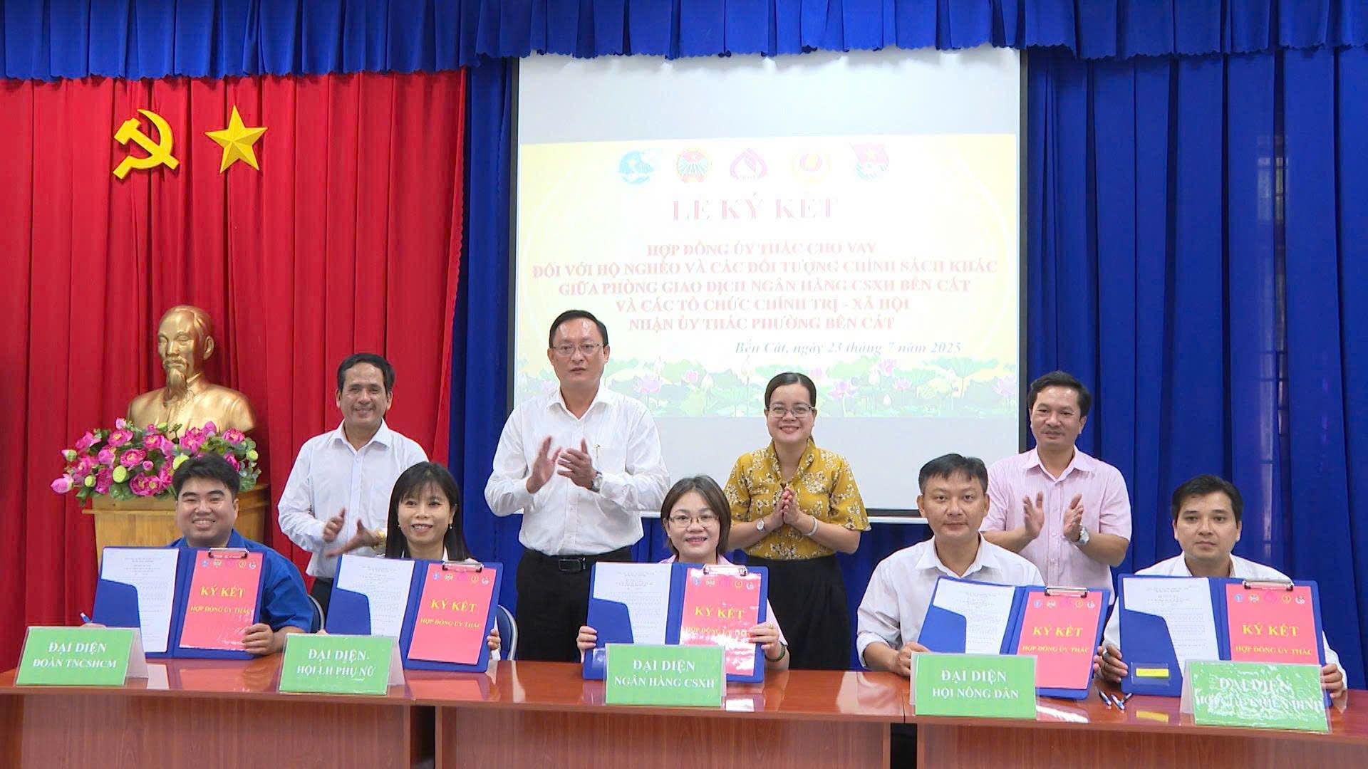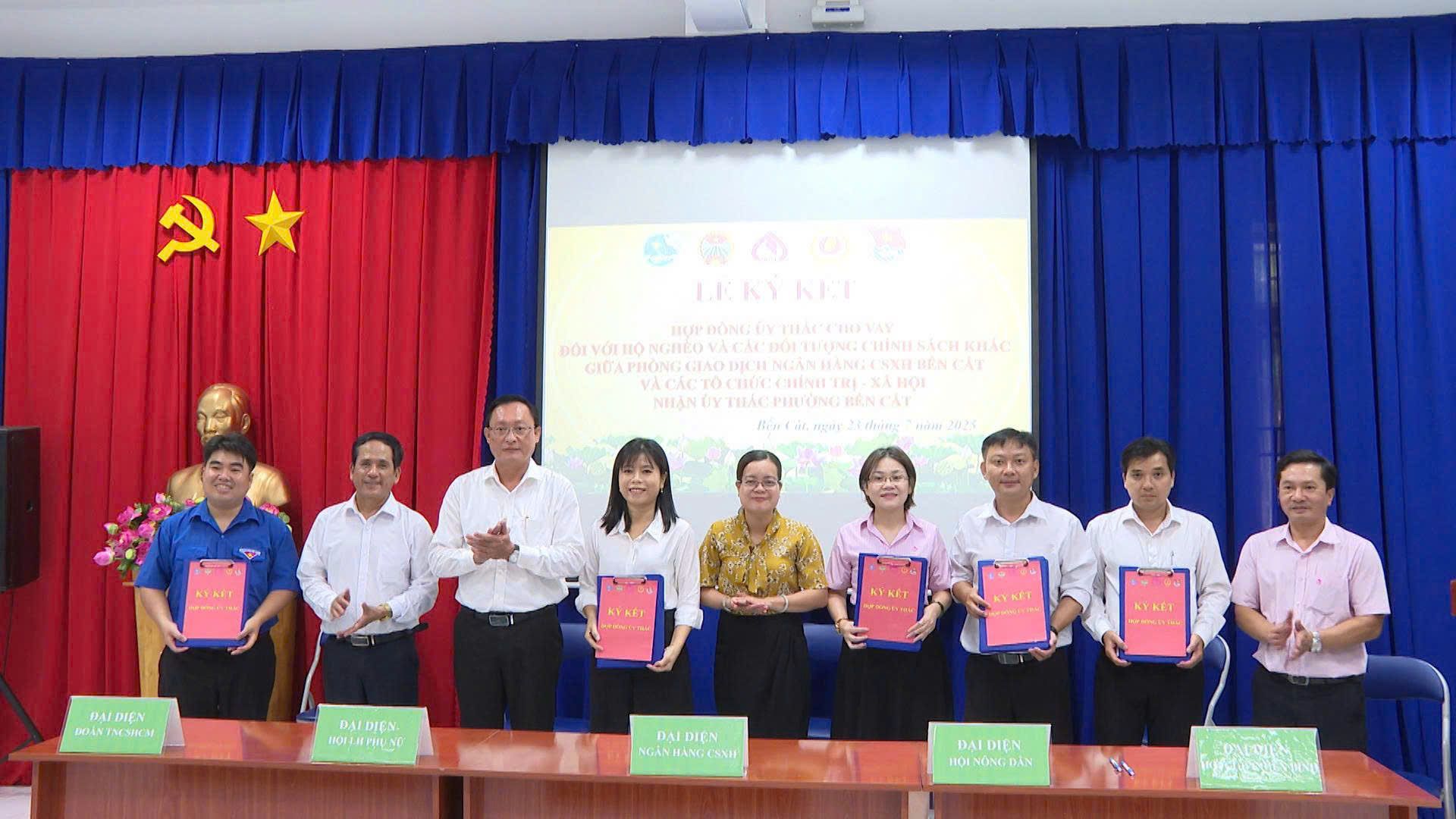 Theo đó, Phòng giao dịch Ngân hàng Chính sách xã hội Bến Cát và các đoàn thể phường đã ký kết với các nội dung ủy thác như: Thực hiện tuyên truyền, phổ biến chủ trương, chính sách của Đảng, Nhà nước và Chính phủ về tín dụng chính sách xã hội đến các tầng lớp nhân dân, nhất là người nghèo và các đối tượng chính sách khác; các chương trình tín dụng và quy trình, hồ sơ, thủ tục vay vốn tại NHCSXH; quy định về hoạt động của Tổ Tiết kiệm và vay vốn (TK&VV). Vận động thành lập Tổ TK&VV và hướng dẫn hoạt động theo quy định của NHCSXH. Đôn đốc Ban quản lý Tổ TK&VV tham gia đầy đủ các phiên giao dịch, giao ban với Bên ủy thác hằng tháng; hướng dẫn tổ viên Tổ TK&VV thực hiện giao dịch với Bên ủy thác. Vận động tổ viên chấp hành Quy ước hoạt động của Tổ TK&VV; thực hành tiết kiệm; giúp đỡ nhau, cùng chia sẻ kinh nghiệm trong việc sử dụng vốn vay đúng mục đích, có hiệu quả; thực hiện trả nợ gốc, trả lãi tiền vay đúng kỳ hạn đã cam kết với Bên ủy thác; sử dụng ứng dụng công nghệ, chuyển đổi số trong quy trình cho vay, sản phẩm dịch vụ và tham gia các hoạt động khác của NHCSXH. Bên cạnh đó, thực hiện công tác kiểm tra, giám sát hoạt động của Tổ TK&VV, Ban Quản lý Tổ và tổ viên Tổ TK&VV; Công tác tập huấn; hoạt động phối hợp thực hiện cùng Bên ủy thác; phí ủy thác trả cho Bên nhận ủy thác; quyền lợi và trách nhiệm Bên nhận ủy thác; quyền và trách nhiệm của Bên ủy thác…