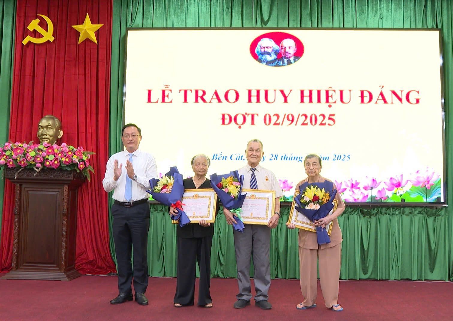 Nhân kỷ niệm 80 năm Cách mạng Tháng Tám (19/8/1945 – 19/82025) và Quốc khánh Nước Cộng hòa xã hội chủ nghĩa Việt Nam (02/9/1945 – 02/9/2025), ngày 28/8, Đảng ủy phường Bến Cát long trọng tổ chức lễ trao tặng huy hiệu Đảng cho 34 đảng viên trực thuộc Đảng bộ phường. Đến dự có đồng chí Nguyễn Trọng Ân – Bí thư Đảng ủy phường Bến Cát, Chủ tịch HĐND phường, đồng chí Nguyễn Văn Chung – Phó Bí thư Thường trực, kiêm Giám đốc Trung tâm Chính trị phường; đồng chí Trần Thị Thảo – Phó Bí thư, Chủ tịch UBND phường, đồng chí Phan Ái Thanh Dung – Chủ tịch Ủy ban MTTQ Việt Nam phường cùng các đồng chí trong Ban Thường vụ phường.