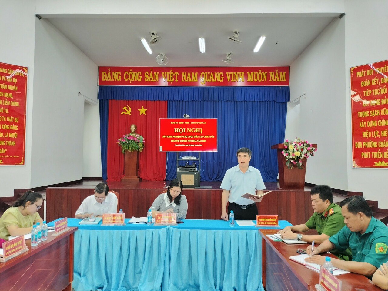 Phường Chánh Phú Hòa rút kinh nghiệm cuộc diễn tập chiến đấu trong KVPT thị xã có một phần thực binh năm 2023