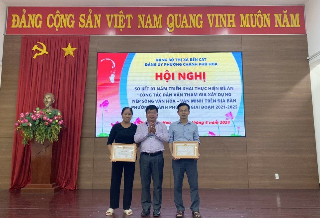 Dịp này, Đảng ủy phường Chánh Phú Hòa đã khen thưởng cho các tập thể và cá nhân thực hiện tốt Đề án “Công tác dân vận tham gia xây dựng nếp sống văn hóa - văn minh giai đoạn 2021-2025”.