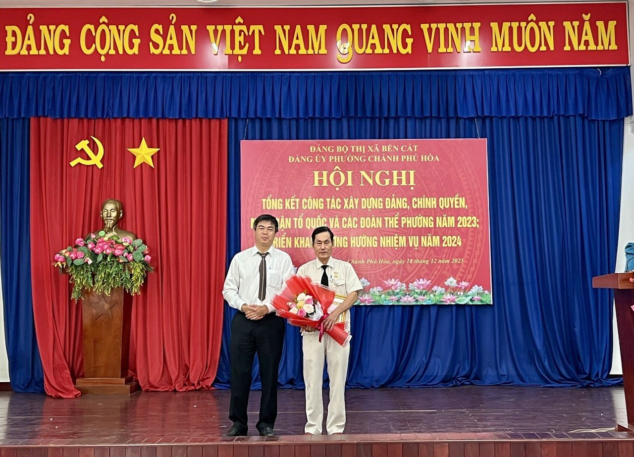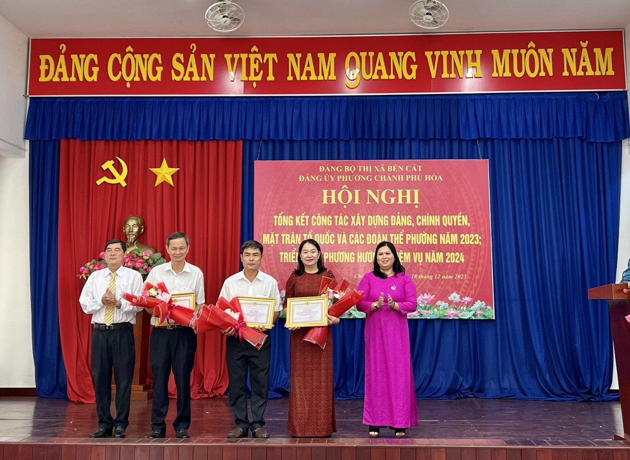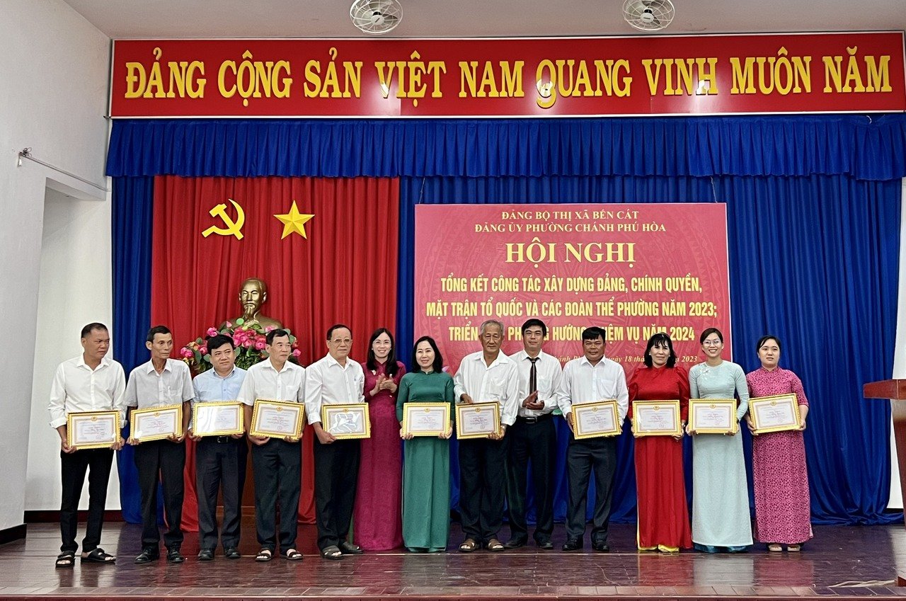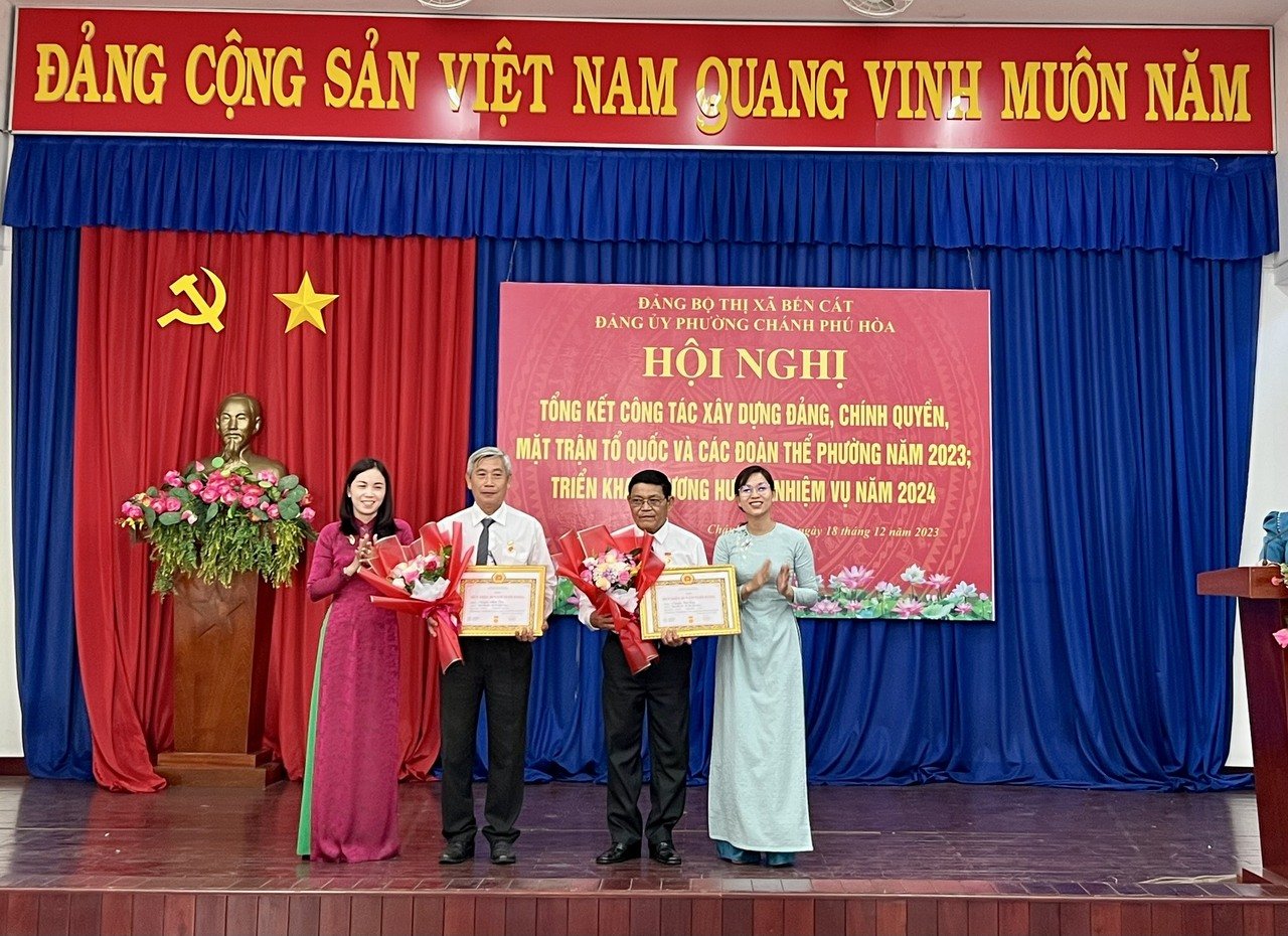 Dịp này, Đảng ủy phường Chánh Phú Hòa đã trao Huy hiệu 60 năm, 50 năm, 45 năm, 40 năm và 30 năm tuổi Đảng cho 07 đảng viên; trao giấy khen cho các tập thể, cá nhân hoàn thành xuất sắc nhiệm vụ năm 2023.