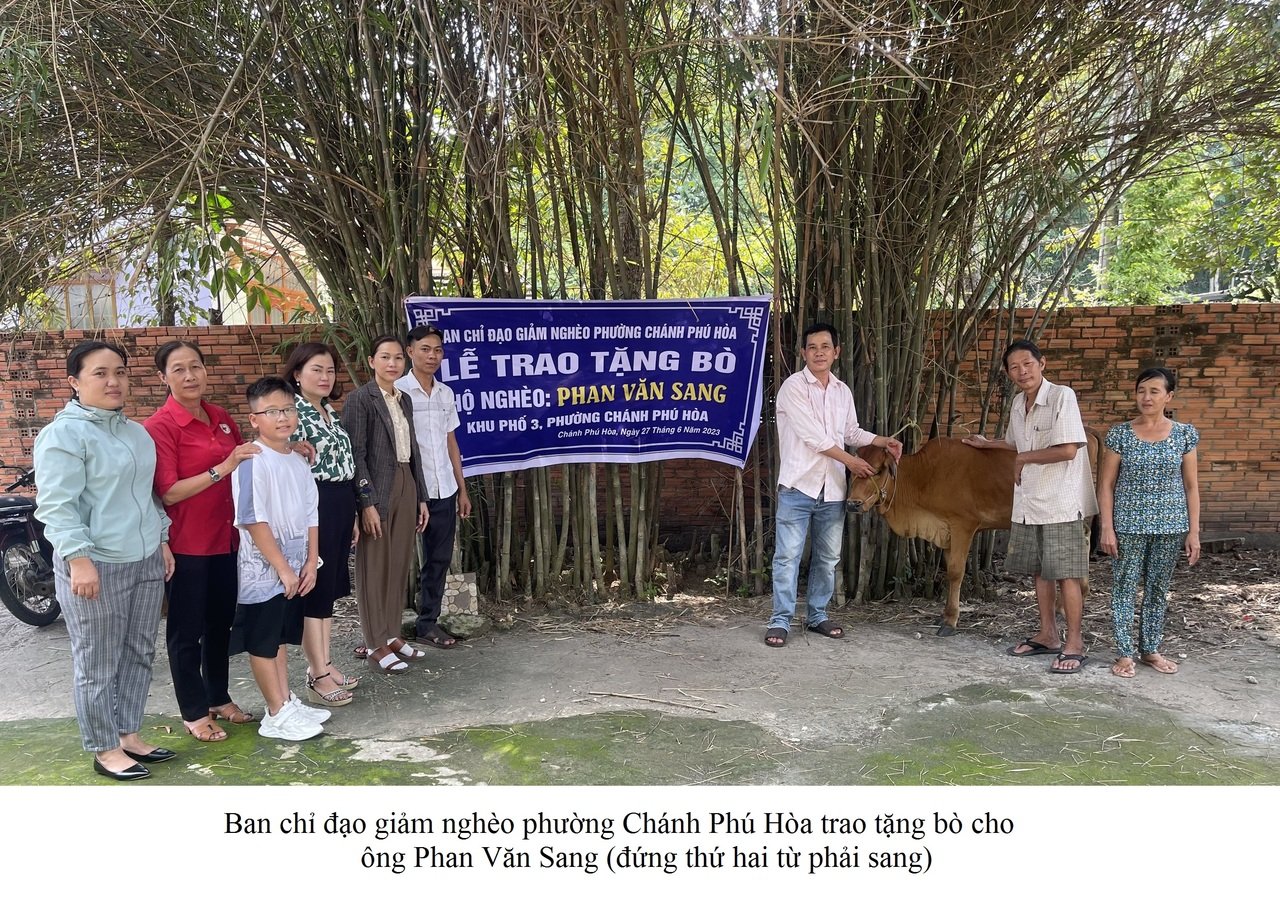 Ngày 27/6, UBND phường Chánh Phú Hòa tổ chức trao tặng bò giống cho gia đình ông Phan Văn Sang là hộ nghèo thuộc khu phố 3 của phường.