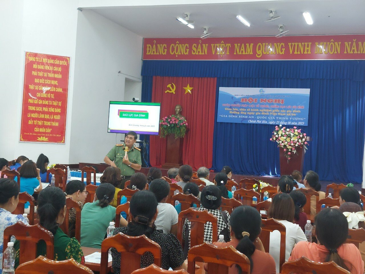 Tại hội nghị, các đại biểu được nghe Thượng tá Huỳnh Văn Sáng – Phó Trưởng phòng xây dựng phong trào, Công an tỉnh Bình Dương phổ biến những nội dung cơ bản của Luật Phòng, chống bạo lực gia đình như: nguyên nhân dẫn đến bạo lực gia đình; kỹ năng phòng, chống bạo lực gia đình và các biện pháp, trách nhiệm bảo vệ nạn nhân bạo lực gia đình của xã hội…