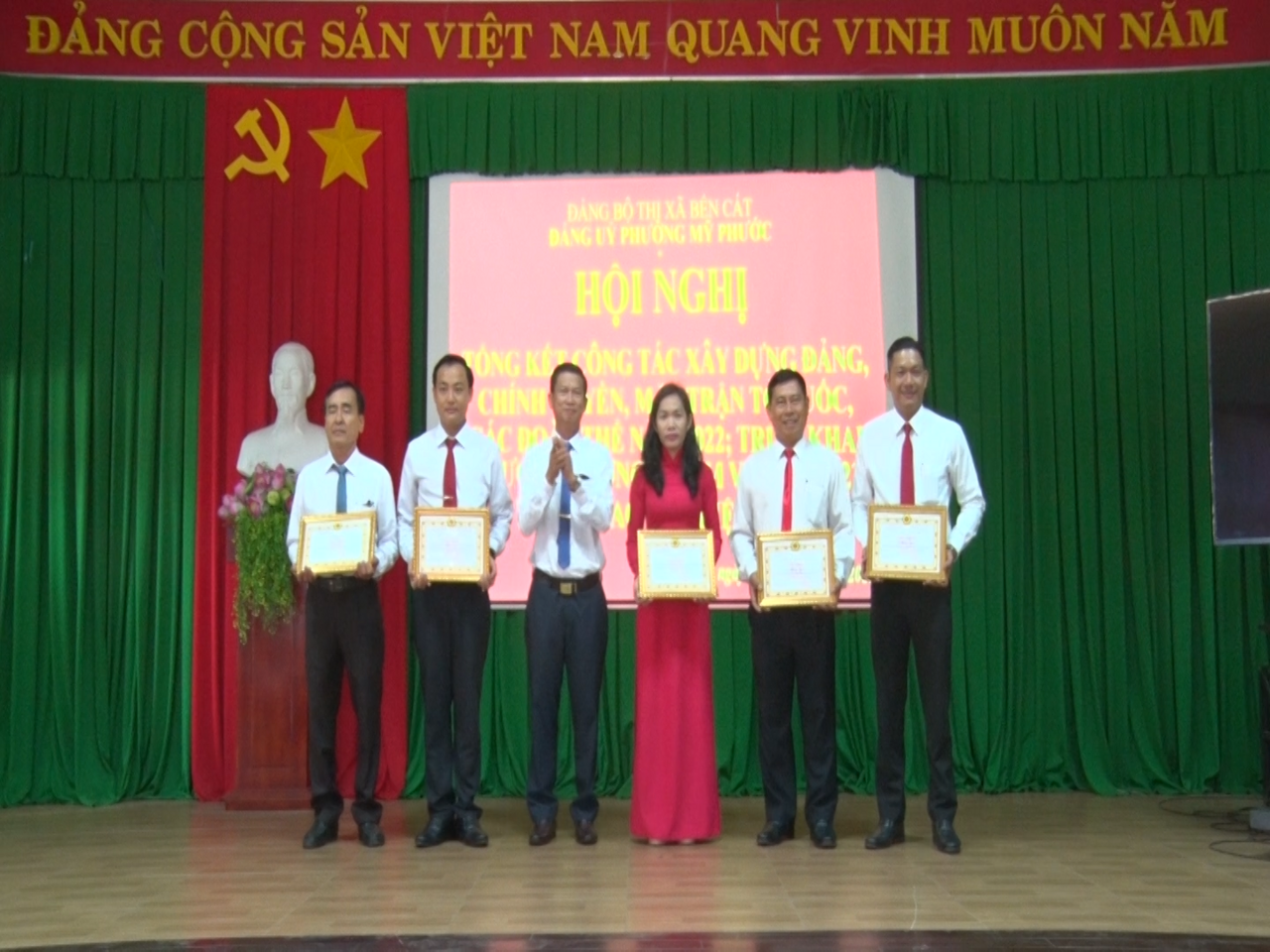 Dịp này, phường Mỹ Phước đã trao tặng Huy hiệu 55, 50, 40 và 30 tuổi đảng cho 08 đảng viên và tặng giấy khen của Đảng bộ phường, UBND phường cho các tập thể, cá nhân hoàn thành xuất sắc nhiệm vụ năm 2022.