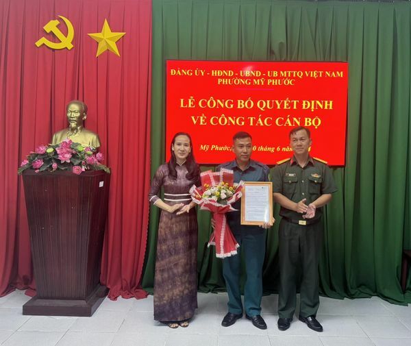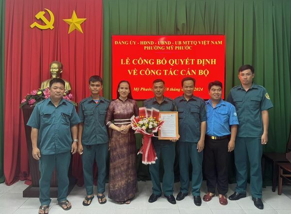 Chiều ngày 10/6, phường Mỹ Phước tổ chức lễ công bố quyết định về công tác cán bộ Ban Chỉ huy Quân sự phường. Đến dự có Thiếu tá Nguyễn Tấn Tài - Phó Chỉ huy trưởng, Tham mưu trưởng Ban CHQS thành phố Bến Cát.