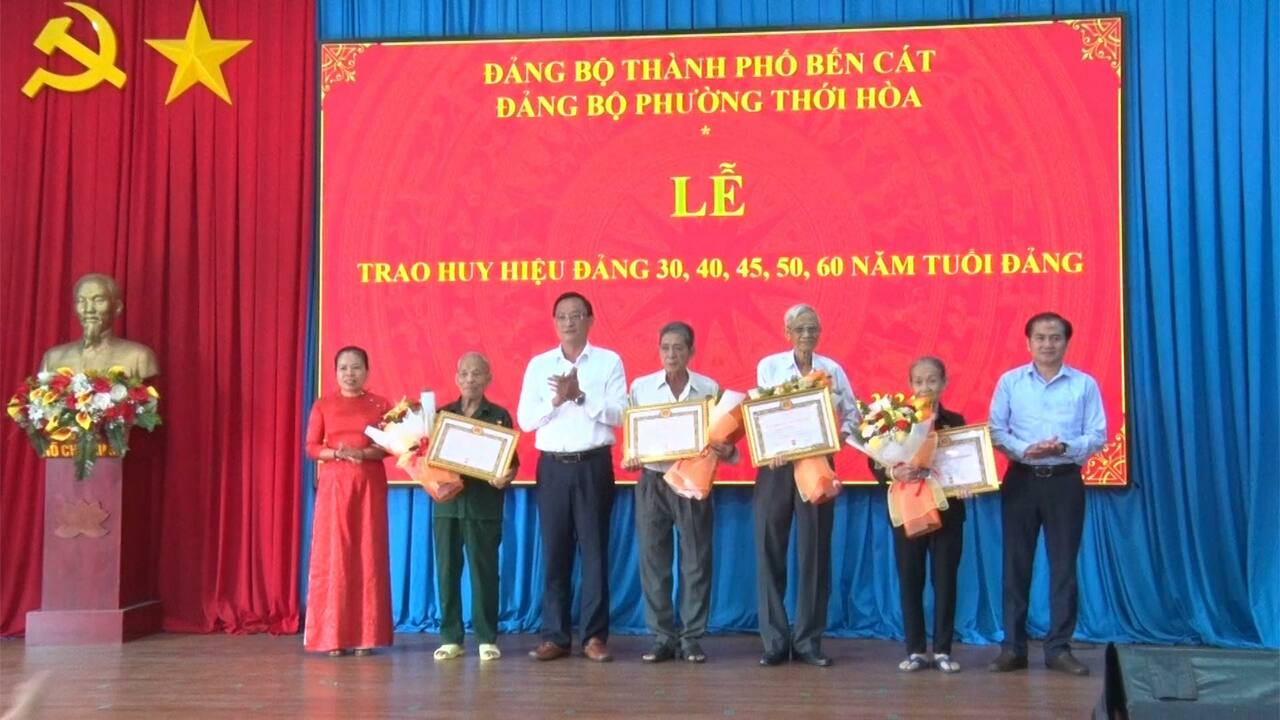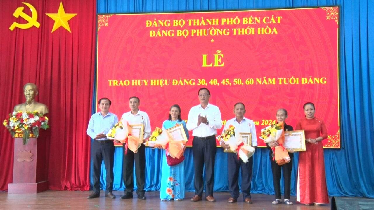Dịp này, Đảng bộ phường Thới Hòa đã trao tặng Huy hiệu 30, 40, 45, 50 và 60 năm tuổi Đảng cho 10 đảng viên thuộc Đảng bộ phường; trao tặng Bằng khen của Tỉnh ủy cho 03 đảng viên hoàn thành xuất sắc nhiện vụ 05 năm liền (2019 – 2023), đồng thời biểu dương 03 đảng viên đạt thành tích xuất sắc trong hội thi Bí thư chi bộ giỏi thành phố Bến Cát năm 2024.