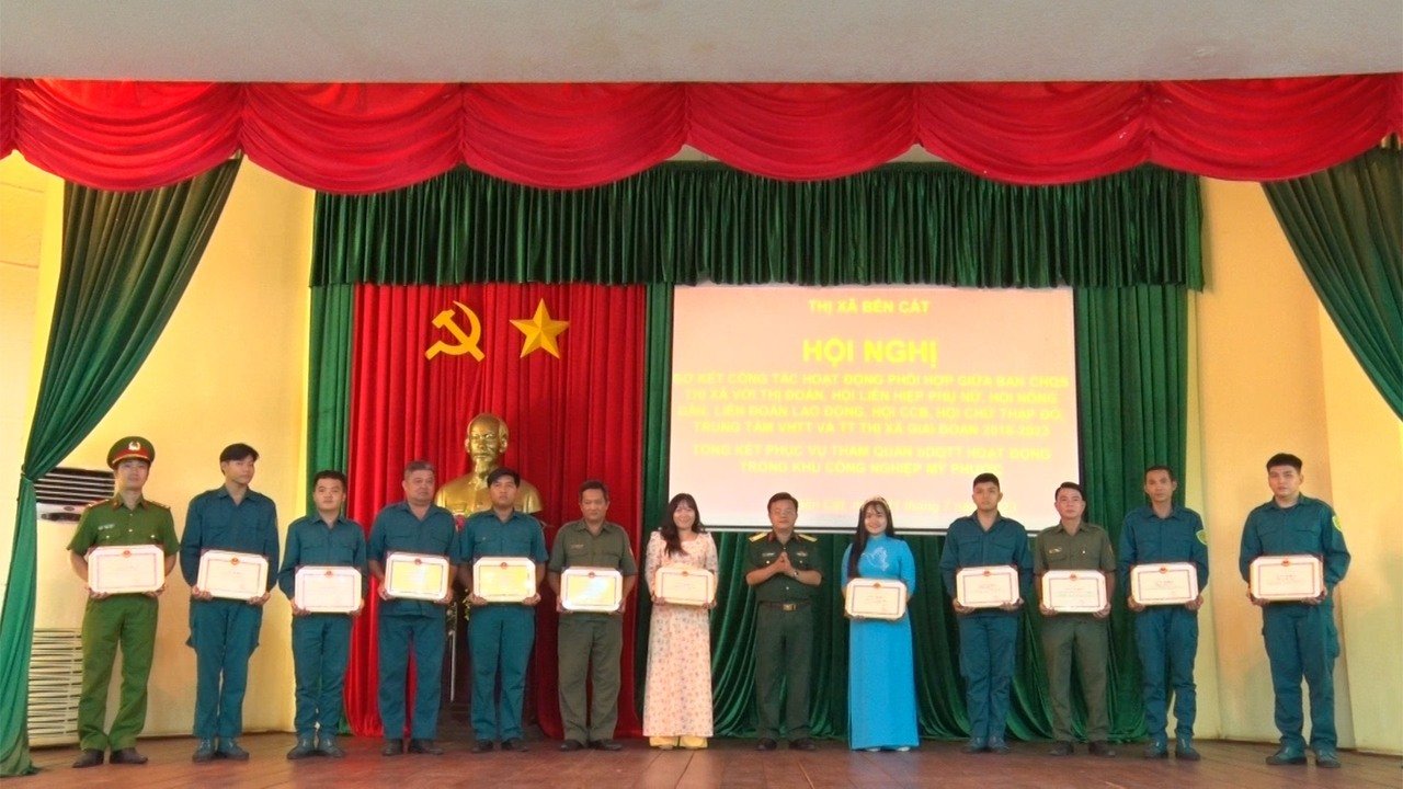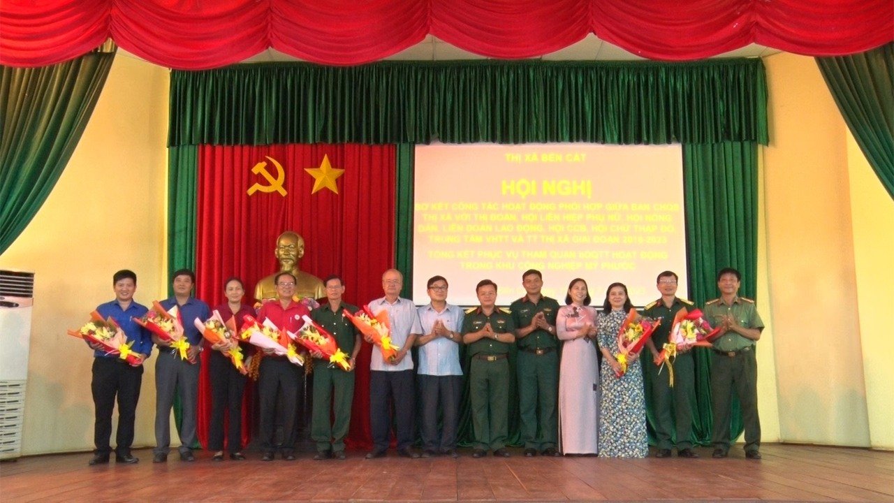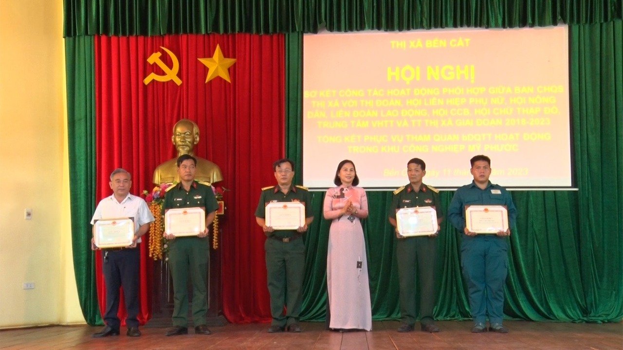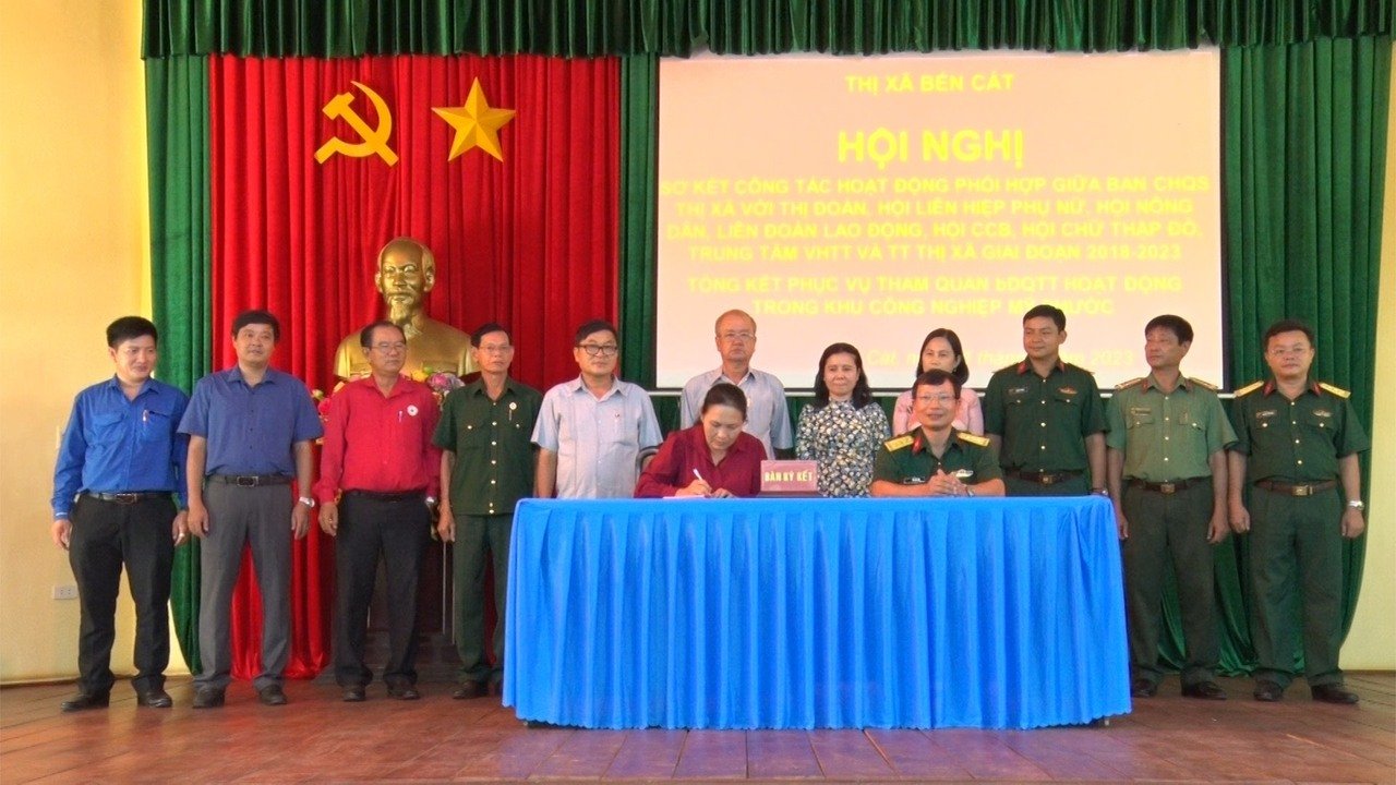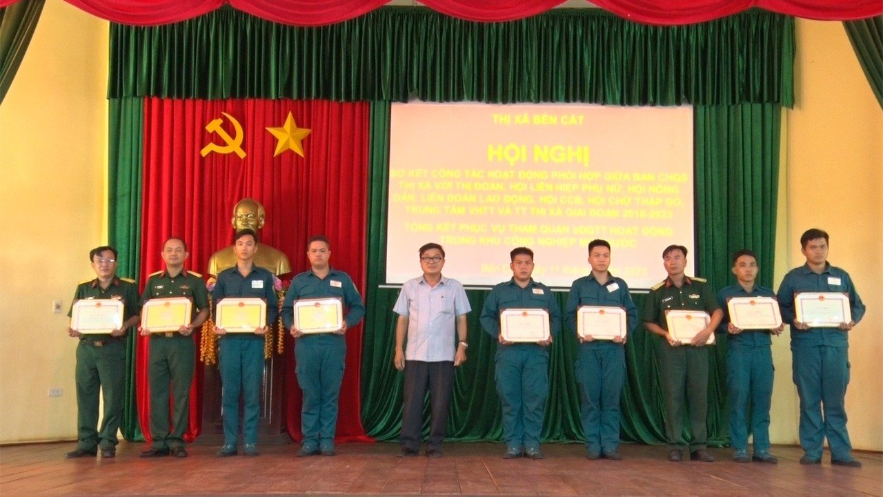 Cụ thể, Ban CHQS phối hợp với Trung tâm Văn hóa, Thể thao và Truyền thanh, Hội Phụ nữ, Hội Chữ thập đó, Đoàn Thanh niên, Liên đoàn lao động thị xã, tập trung tuyên truyền nhiệm vụ quân sự-quốc phòng (QS-QP) của thị xã, các xã, phường; công tác huấn luyện, SSCĐ, xây dựng tổ chức Đảng trong sạch vững mạnh, xây dựng đơn vị vững mạnh toàn diện tiêu biểu, mẫu mực, gương người tốt, việc tốt. Tuyên truyền về công tác tuyển chọn, gọi công dân nhập ngũ; phối hợp giáo dục chính trị tư tưởng, giáo dục truyền thống cho đoàn viên, thanh niên là một nhiệm vụ quan trọng, thu hút trên 12.000 lượt cán bộ, chiến sĩ, đoàn viên, thanh niên, hội viên tham gia. Tích cực tham gia các chương trình phát triển kinh tế - xã hội ở từng cơ sở, phát huy các phong trào “Phụ nữ Bình Dương có sức khỏe, tri thức, sáng tạo, trách nhiệm”, “Phụ nữ giúp nhau làm kinh tế gia đình”, chương trình “giảm nghèo”; vận động “ngày tiết kiệm vì phụ nữ nghèo” hỗ trợ vốn, giải quyết việc làm cho hội viên, gia đình quân nhân, DQTV, dự bị động viên (DBĐV) gặp khó khăn cho trên 1.000 lượt người với kinh phí gần 300 triệu đồng.