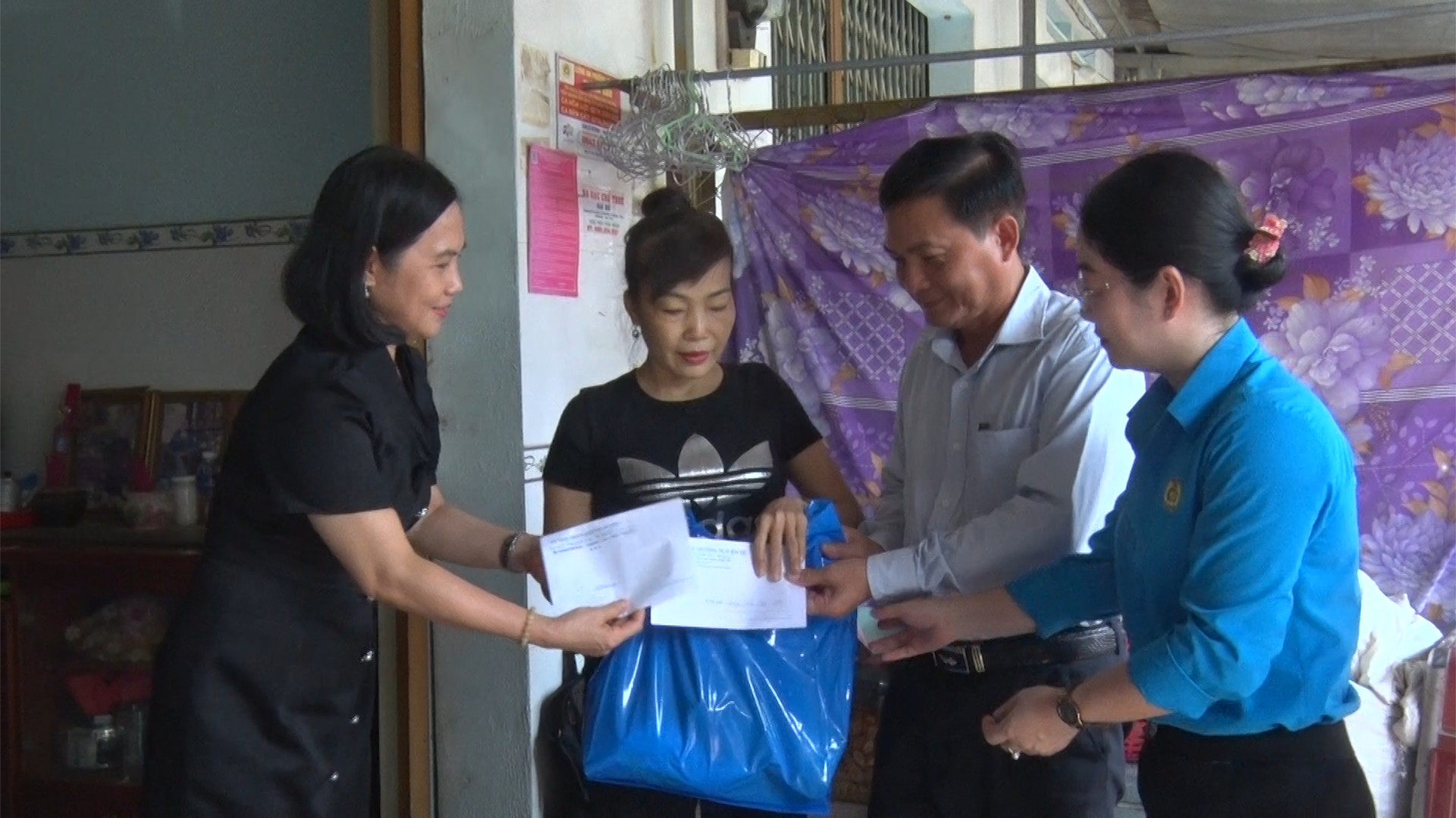 Dịp này, Đoàn cũng trực tiếp đến thăm, động viên và tặng quà cho 02 công nhân lao động có hoàn cảnh đặc biệt khó khăn mắc bệnh hiểm nghèo, gồm quà, tiền mặt và phiếu khám bệnh tại Bệnh viện Medic Bình Dương với tổng trị giá 6 triệu đồng; trao tặng 100 triệu đồng “Hỗ trợ mái ấm công đoàn” cho đoàn viên Nguyễn Thị Thùy Nhân, sinh năm 1992, tại khu phố 2, phường Tân Định.