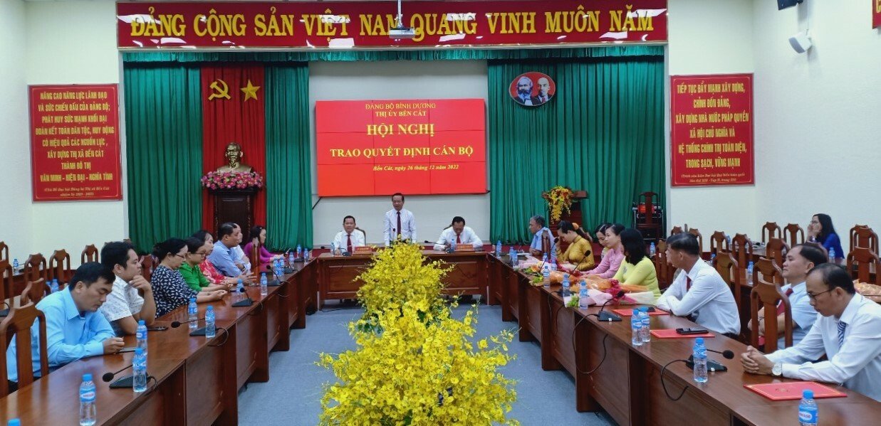 Phát biểu tại lễ trao quyết định, đồng chí Bùi Minh Thạnh – Bí thư Thị ủy chúc mừng các đồng chí được điều động, bổ nhiệm chức vụ mới, mong muốn các đồng chí trên cương vị mới sẽ tiếp tục cống hiến trí tuệ, sức lực, tài năng để xây dựng thị xã Bến Cát ngày càng văn minh – giàu đẹp – nghĩa tình.