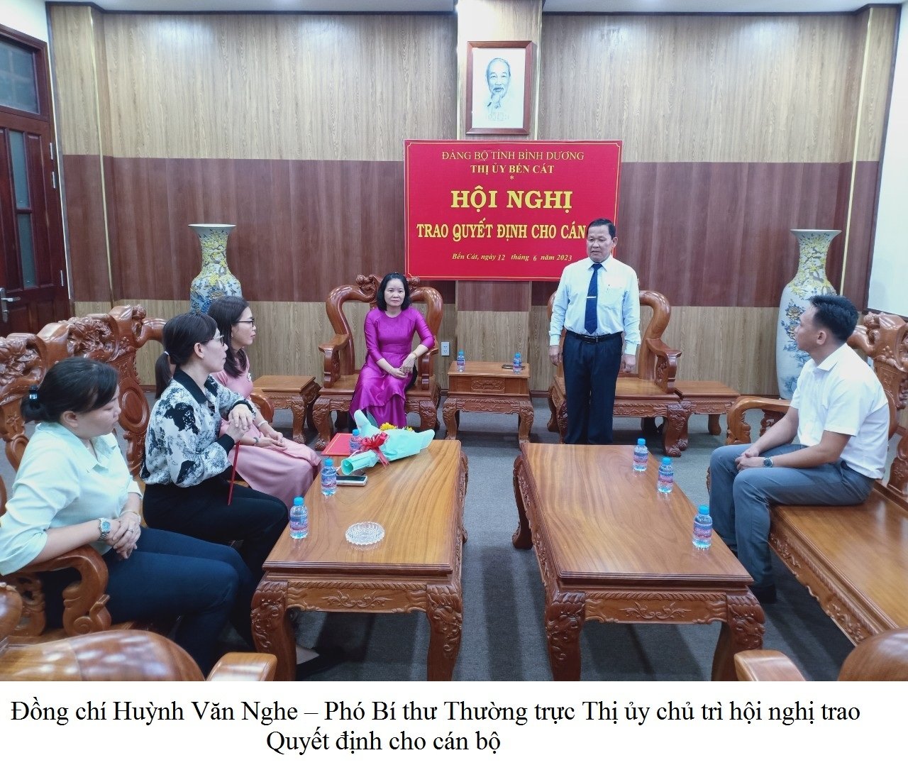 Chiều ngày 12/6, Thị ủy Bến Cát tổ chức trao Quyết định bổ nhiệm Phó Giám đốc Trung tâm Chính trị thị xã. Đến dự có đồng chí Huỳnh Văn Nghe – Phó Bí thư Thường trực Thị ủy, đồng chí Nguyễn Thị Yến Loan – Trưởng Ban Tổ chức Thị ủy.