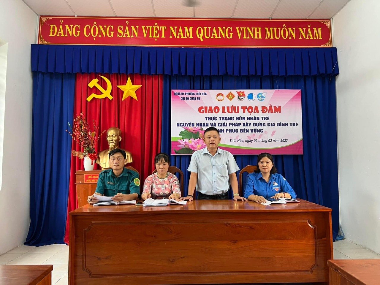 Thiết thực chào mừng kỷ niệm 113 năm ngày Quốc tế phụ nữ 8/3 và 1983 năm khởi nghĩa Hai Bà Trưng; chào mừng kỷ niệm 92 năm ngày thành lập Đoàn thanh niên Cộng sản Hồ Chí Minh (26/3/1931 - 26/3/2023), Ban chỉ huy Quân sự phường Thới Hòa phối hợp với Ủy ban MTTQ Việt Nam phường, Hội LHPN, Đoàn thanh niên phường tổ chức giao lưu tọa đàm nói chuyện chuyên đề về thực trạng hôn nhân trẻ - nguyên nhân và giải pháp xây dựng gia đình trẻ hạnh phúc bền vững với sự tham gia của hơn 60 đại biểu là khu đội trưởng; chi hội trưởng các chi hội phụ nữ; bí thư, phó bí thư các chi đoàn trên địa bàn.