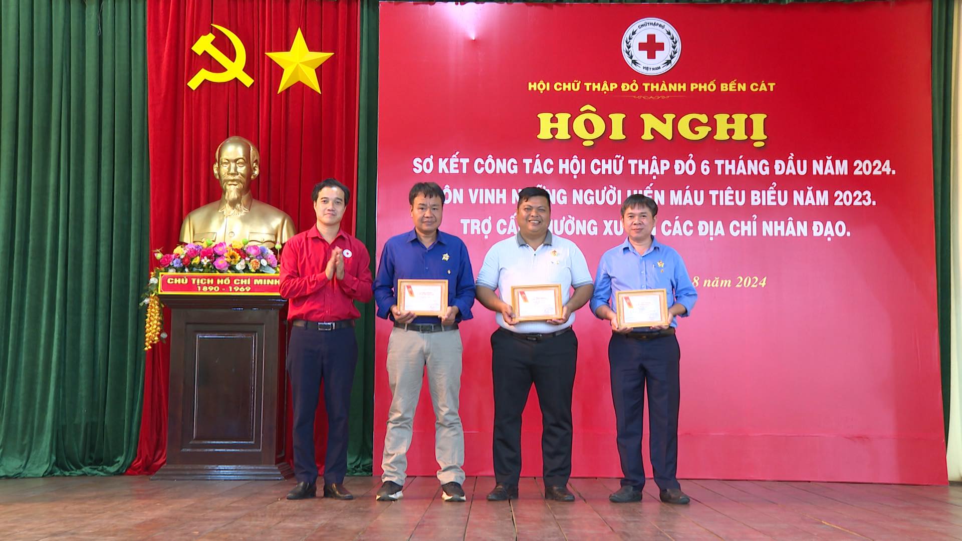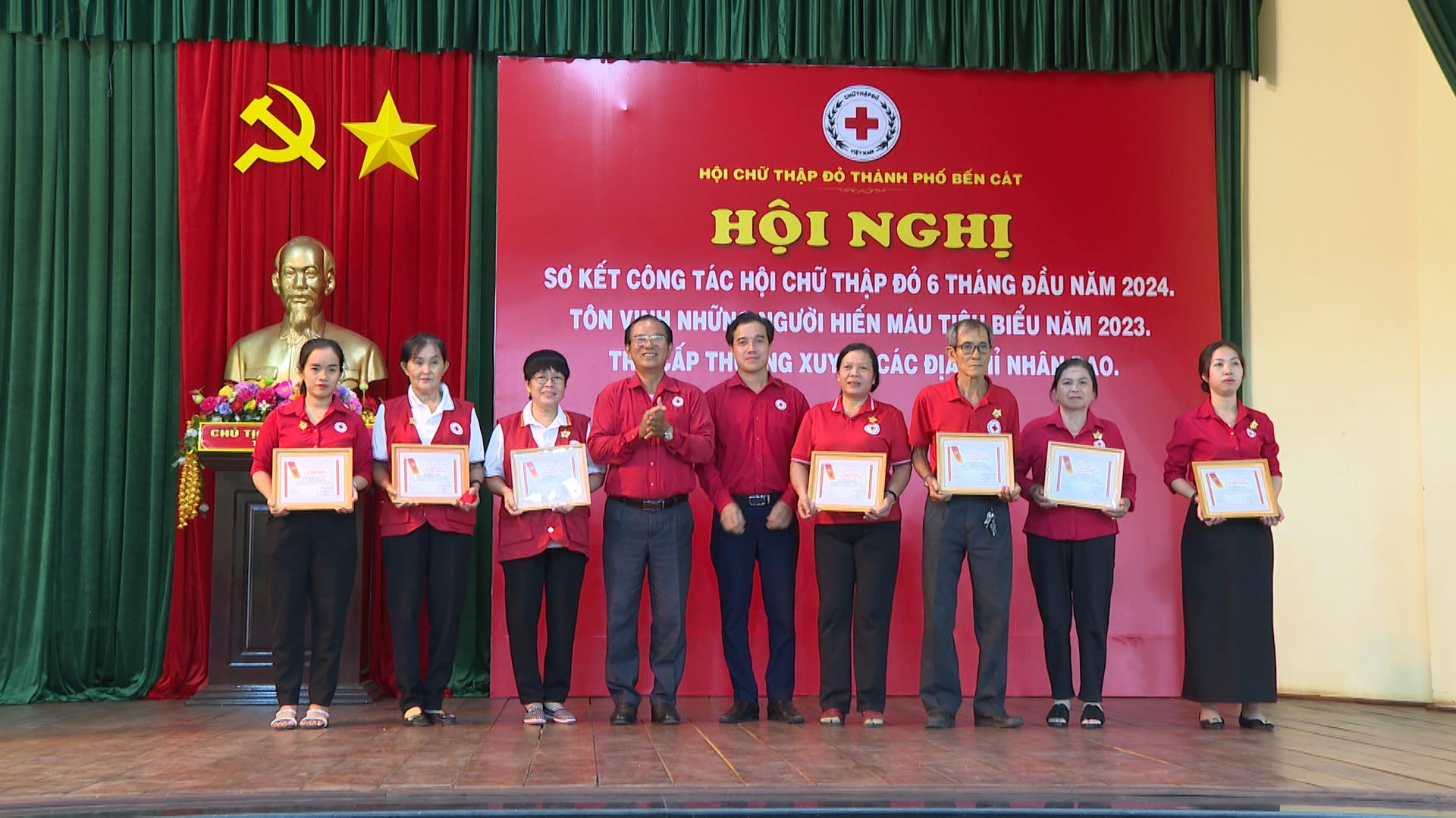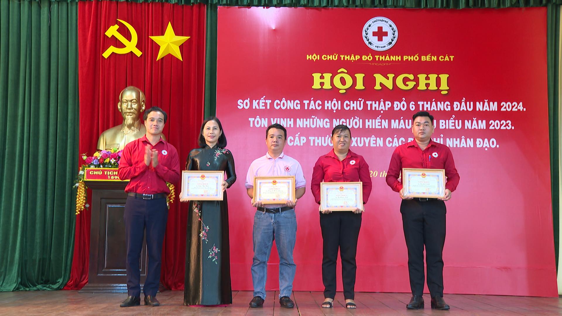 Dịp này, Trung ương Hội Chữ thập đỏ Việt Nam đã trao kỷ niệm chương “Vì sự nghiệp Nhân đạo” cho các cá nhân có nhiều đóng góp cho công tác chữ thập đỏ, khen thưởng cho các cá nhân đạt thành tích xuất sắc trong hoạt động phong trào Hội Chữ thập đỏ 2 năm liên tục (2022-2023); UBND tỉnh, Ban chỉ đạo HMTN tỉnh, UBND thành phố Bến Cát khen thưởng cho hơn 230 gia đình và tập thể, cá nhân hiến máu từ 5 đến 40 lần. Hội CTĐ thành phố đã trao trợ cấp thường xuyên 23 địa chỉ nhân đạo mỗi phần trị giá 1,5 triệu đồng.