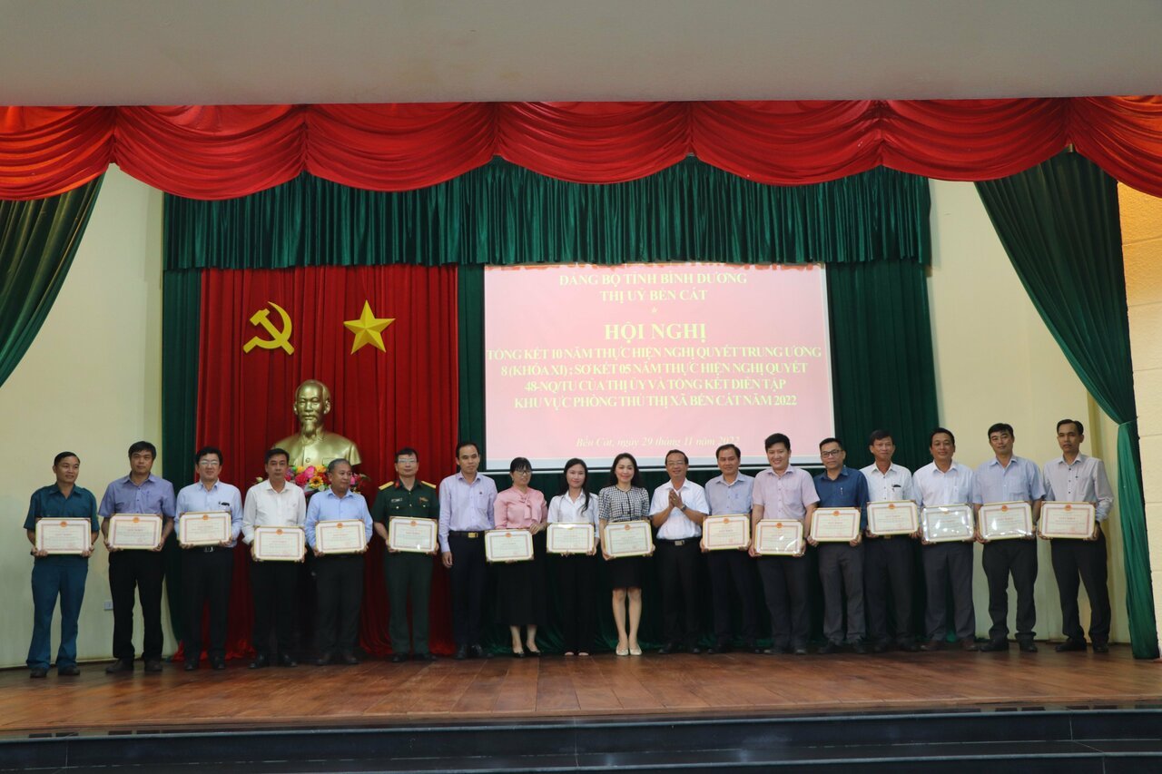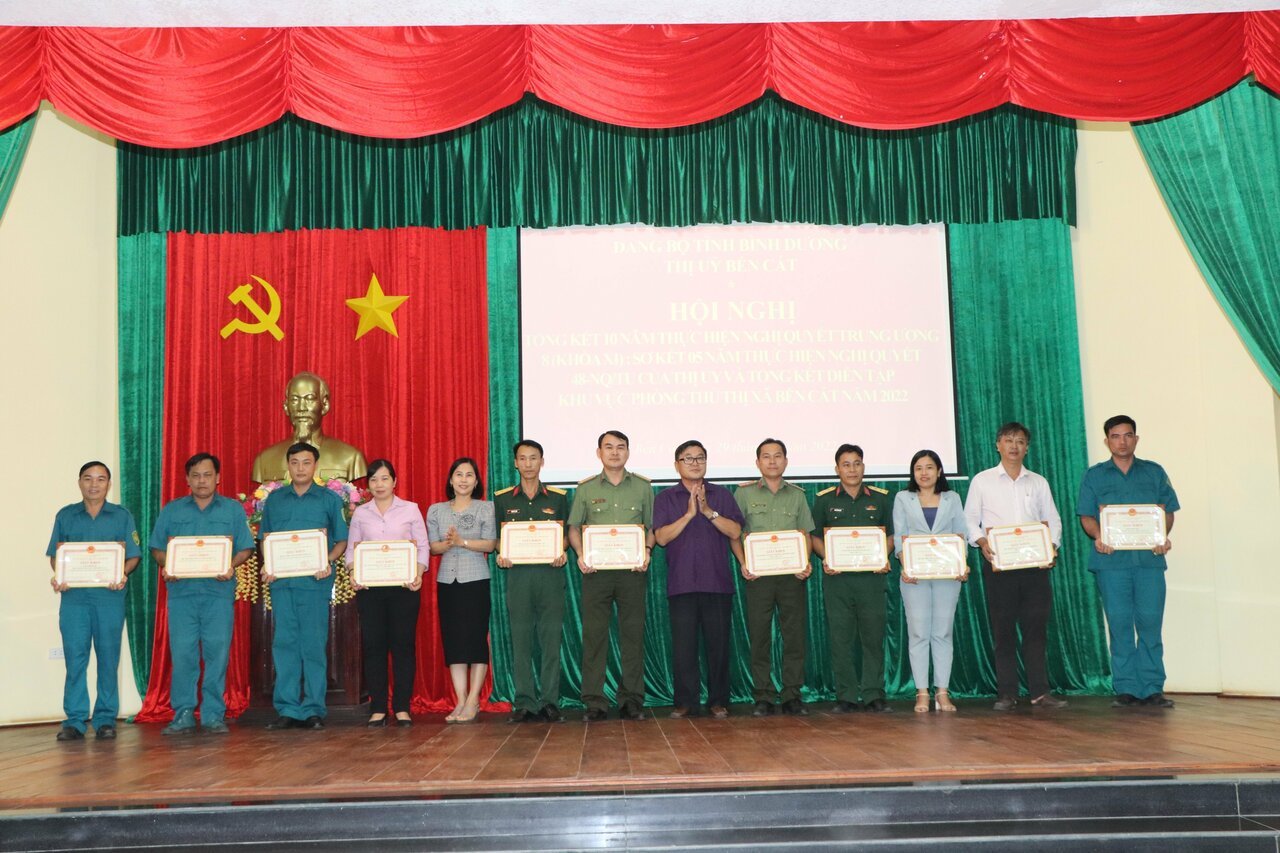 Dịp này, UBND thị xã khen thưởng cho 45 tập thể và hơn 100 cá nhân đạt thành tích xuất sắc trong việc thực hiện Nghị quyết Trung ương 8 khóa XI về Chiến lược bảo vệ Tổ quốc trong tình hình mới và công tác diễn tập khu vực phòng thủ thị xã năm 2022.