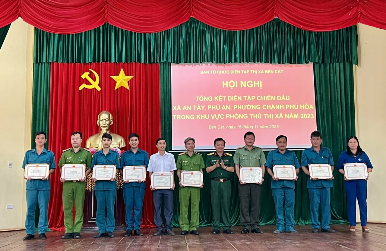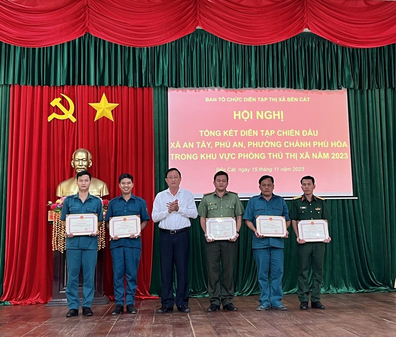 Dịp này, UBND thị xã Bến Cát biểu dương và khen thưởng 06 tập thể và 15 cá nhân đã có thành tích xuất sắc trong diễn tập chiến đấu khu vực phòng thủ năm 2023.