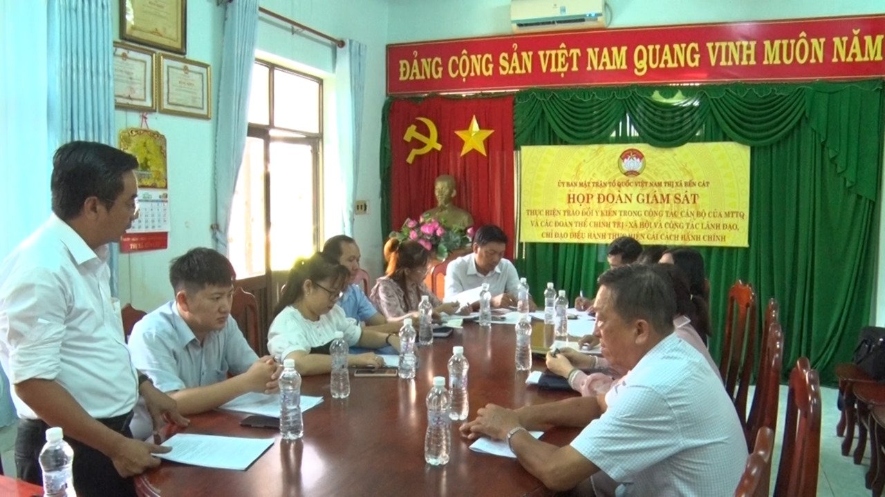 Nội dung giám sát công tác lãnh đạo, chỉ đạo triển khai và thực hiện các văn bản liên quan đến thực hiện trao đổi ý kiến trong công tác cán bộ của Đảng ủy xã, phường đối với chức danh chủ chốt của MTTQ và các đoàn thể chính trị - xã hội cấp xã. Quy trình và cách thức thực hiện trao đổi công tác cán bộ để MTTQ và các đoàn thể chính trị - xã hội thị xã tham gia ý kiến với cấp ủy cơ sở trong việc bố trí cán bộ chủ chốt đang công tác tại địa phương. Đoàn Giám sát sẽ làm việc trực tiếp với Đảng ủy phường Mỹ Phước và các xã An Điền, xã An Tây, xã Phú An.