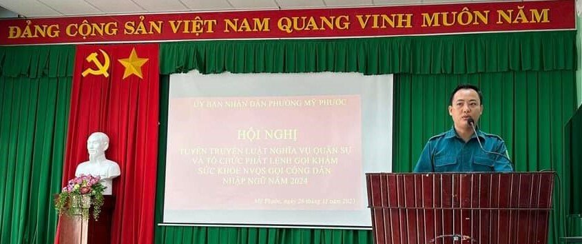 Ngày 26/11, Ban CHQS phường Mỹ Phước tổ chức Hội nghị triển khai Luật Nghĩa vụ quân sự (NVQS) và trao lệnh khám sức khoẻ chuẩn bị gọi công dân nhập ngũ năm 2024.