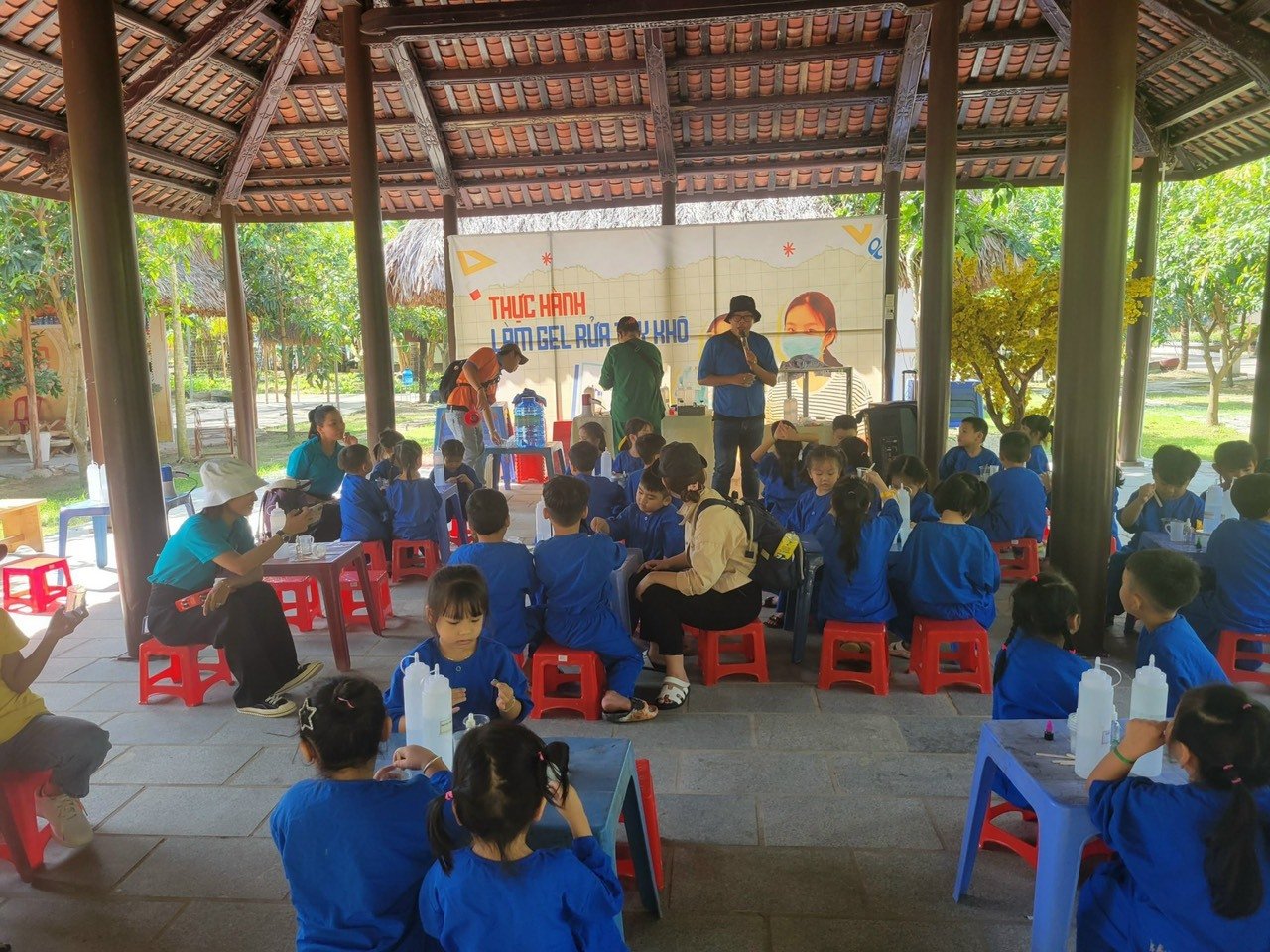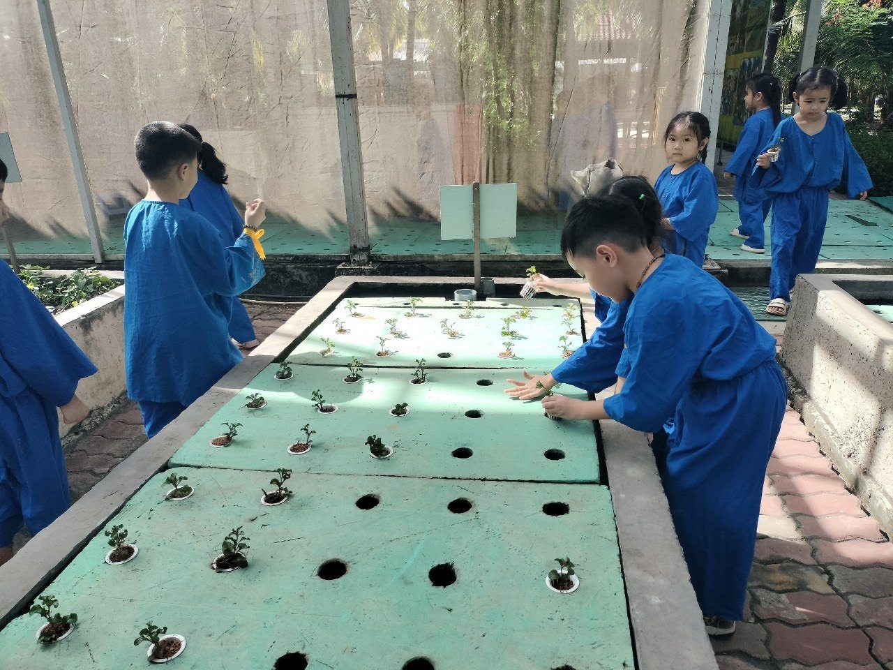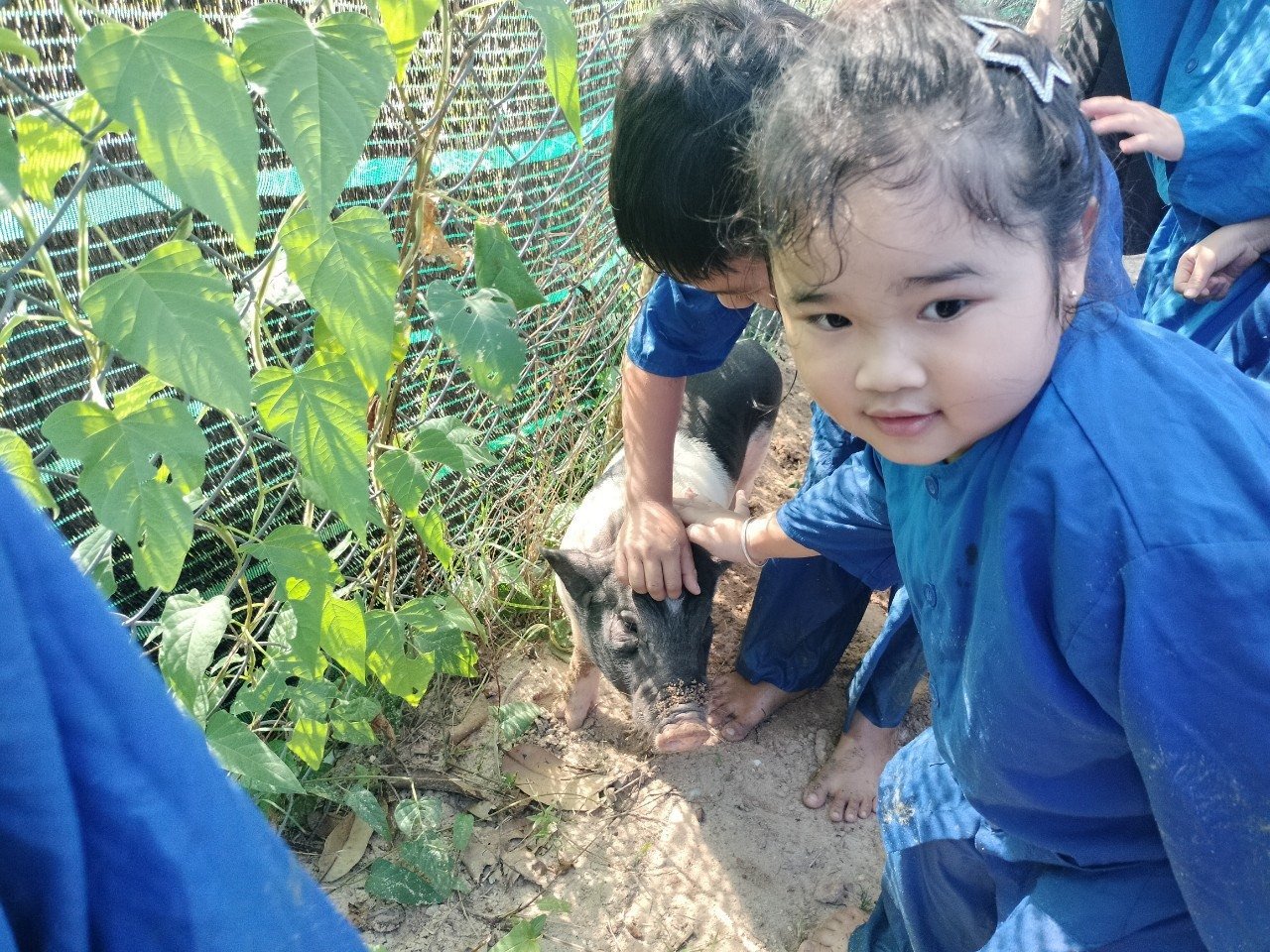 Tại đây, các bé đã được tham quan mô hình trồng rau trong nhà kính, giúp các bé biết thêm tên gọi của một số loại rau như: su hào, bắp cải, cà chua,… Đồng thời, các bé được tự tay xúc đất để trồng các hạt giống, cây giống; tự tay làm các sản phẩm của riêng mình qua trải nghiệm làm gốm Bát Tràng; Trải nghiệm không gian làm trống lắc tay, làm tranh Đông Hồ; trải nghiệm bắt cá, bắt vịt, trồng lúa,…