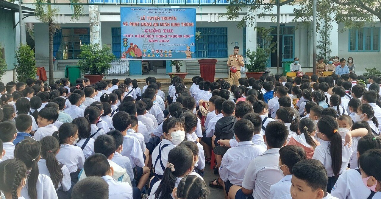 Ngày 03/10, Đội Cảnh sát giao thông – Công an thị xã, Phòng Tư pháp thị xã, trường Tiểu học Võ Thị Sáu – phường Mỹ Phước cùng phối hợp tổ chức tuyên truyền Luật Giao đường bộ cho hơn 770 học sinh của trường.