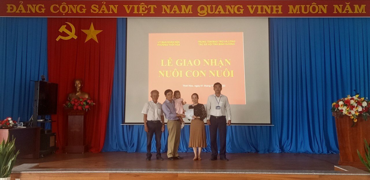 Chiều ngày 01/11, UBND phường Thới Hòa, Trung tâm Bảo trợ và Công tác xã hội tỉnh Bình Dương cùng phối hợp tổ chức lễ giao nhận nuôi con nuôi. Tham dự lễ có ông Nguyễn Chí Lâm – Phó Chủ tịch UBND phường Thới Hòa, ông Nguyễn Bảo Thanh – Giám đốc Trung tâm Bảo trợ và Công tác xã hội tỉnh Bình Dương.