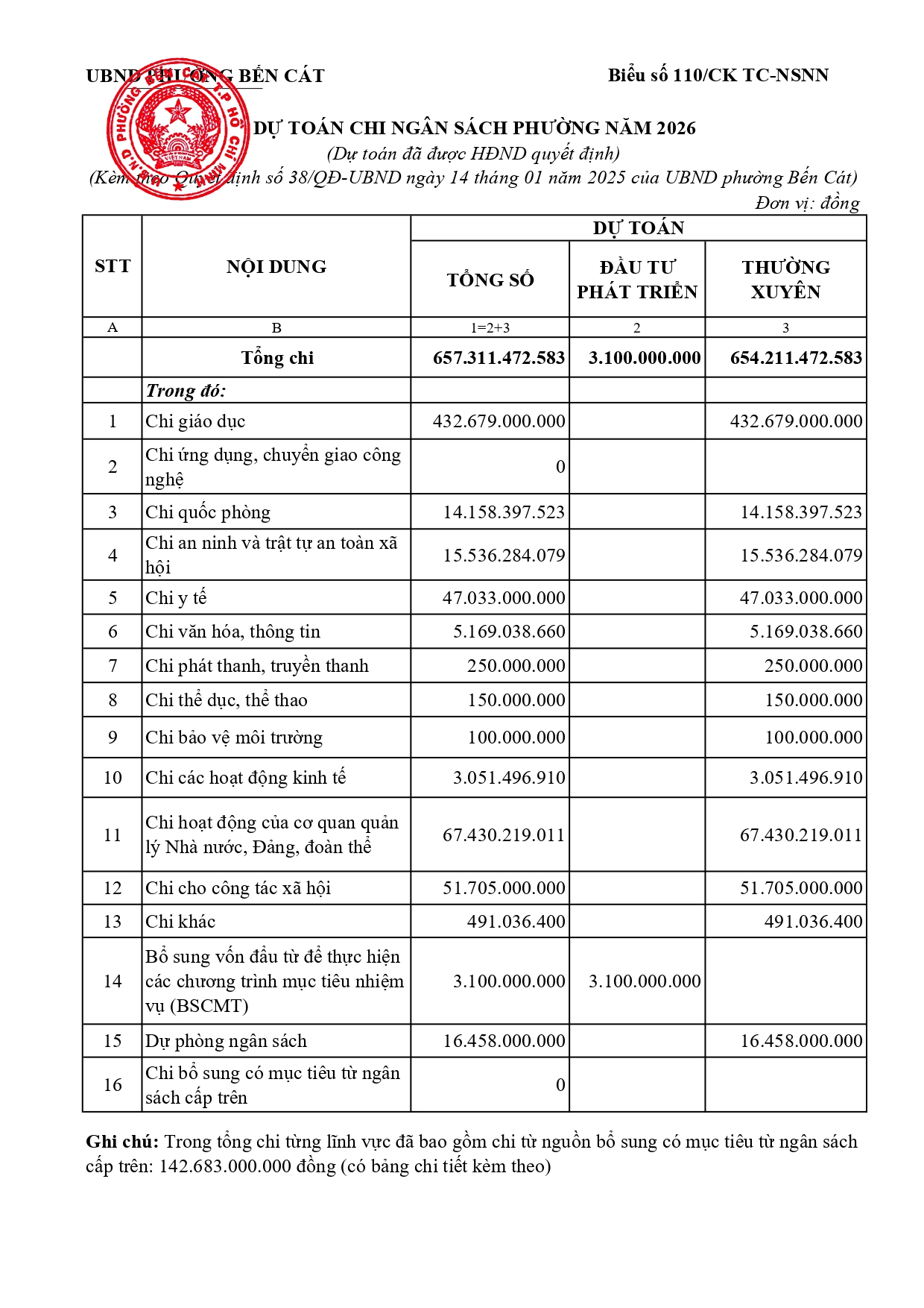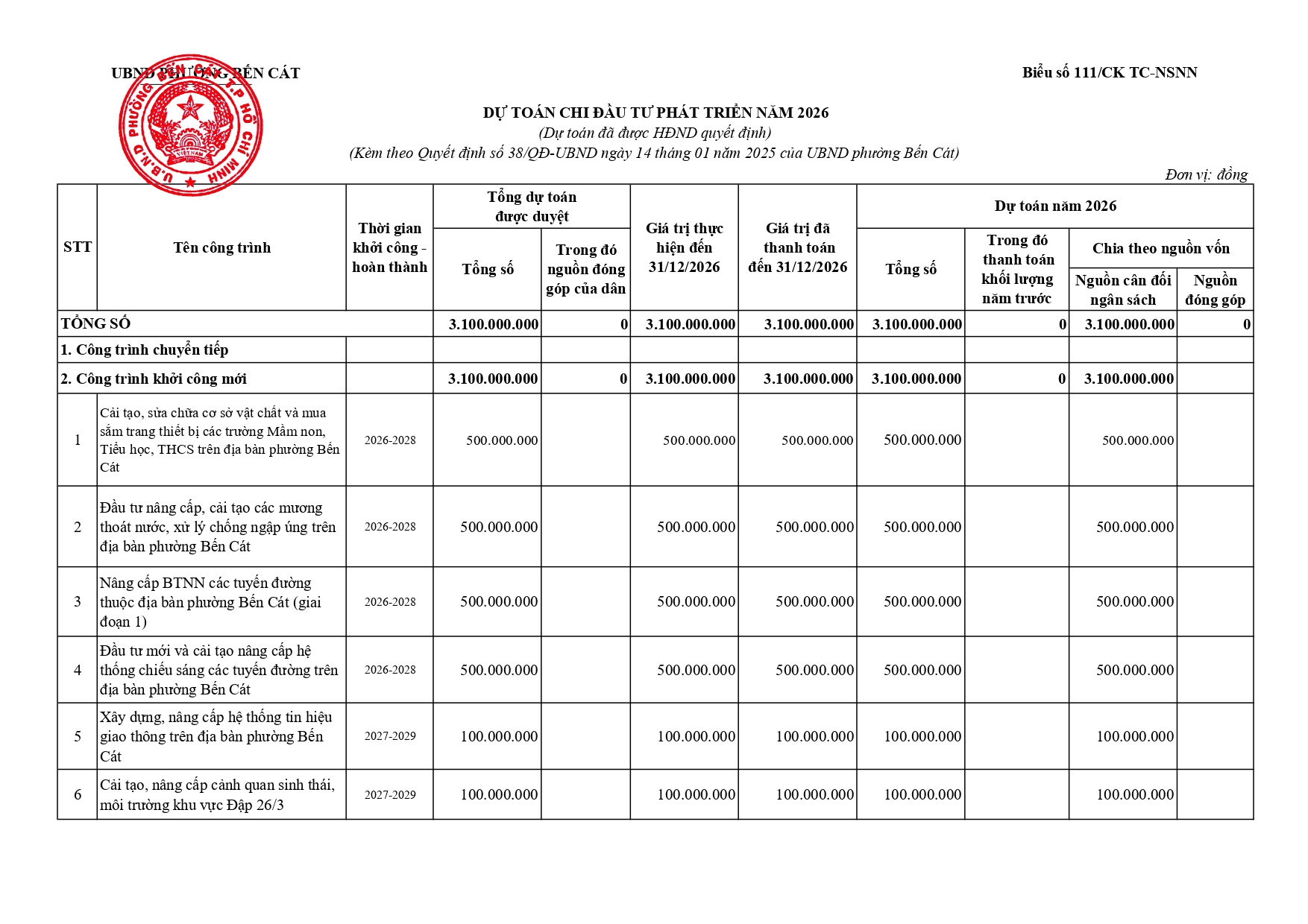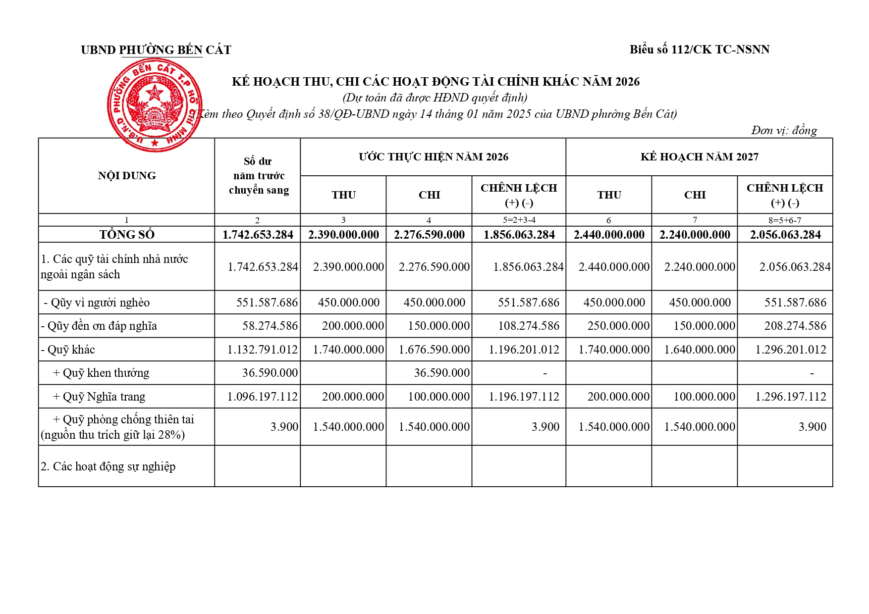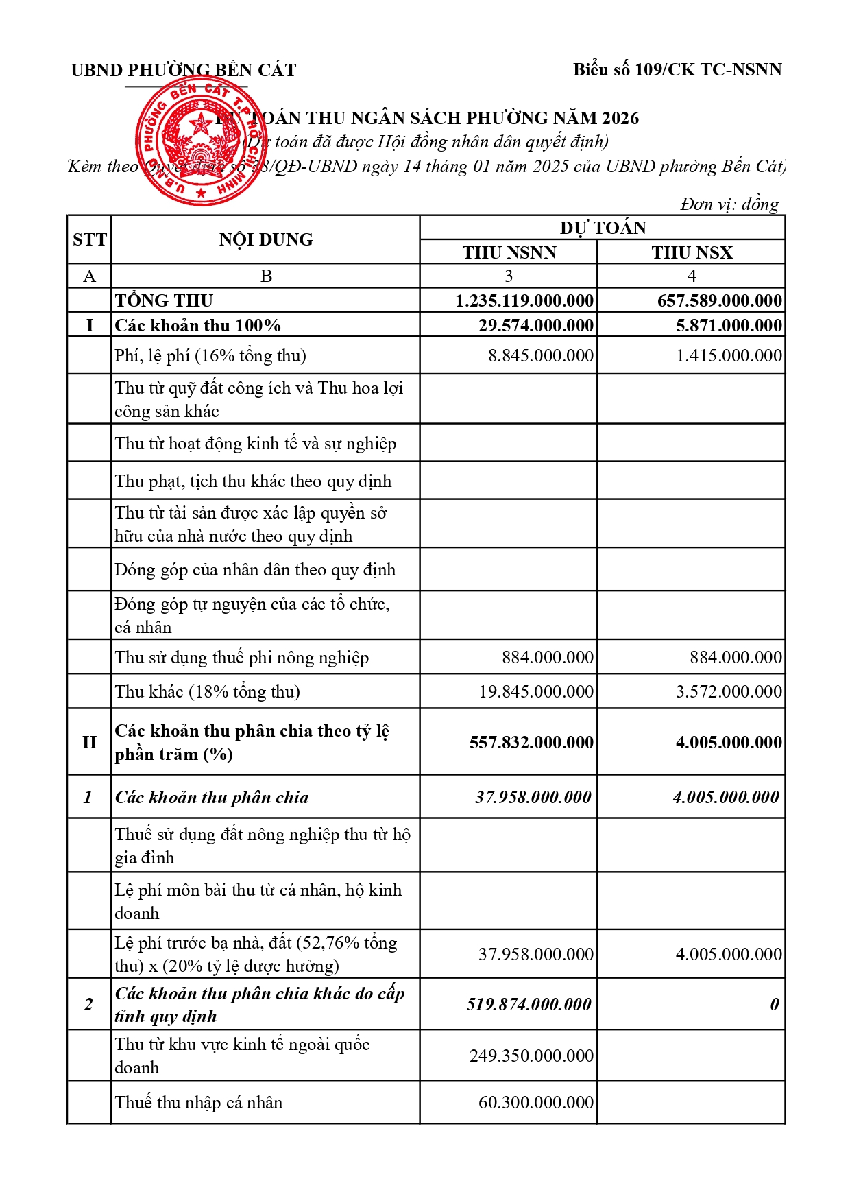 Về việc công bố công khai dự toán thu NSNN trên địa bàn; Dự toán thu, chi và phân bổ ngân sách phường Bến Cát năm 2026