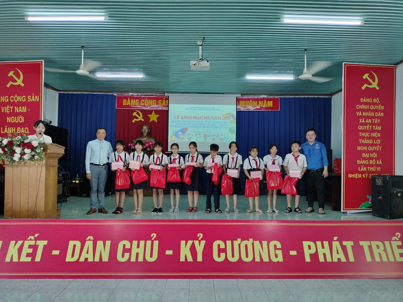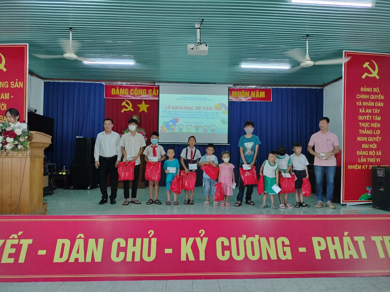 Tại lễ khai mạc hè, xã An Tây vận động mạnh thường quân trao tặng 50 phần quà cho các em có thành tích học tập xuất sắc và các em học sinh nghèo hiếu học trên địa bàn xã.