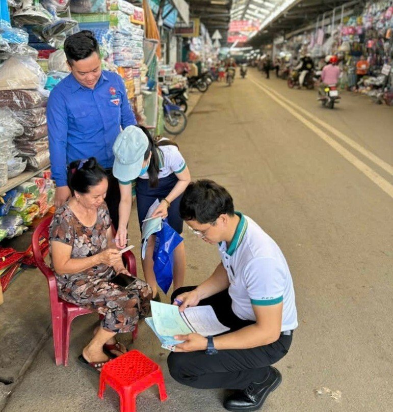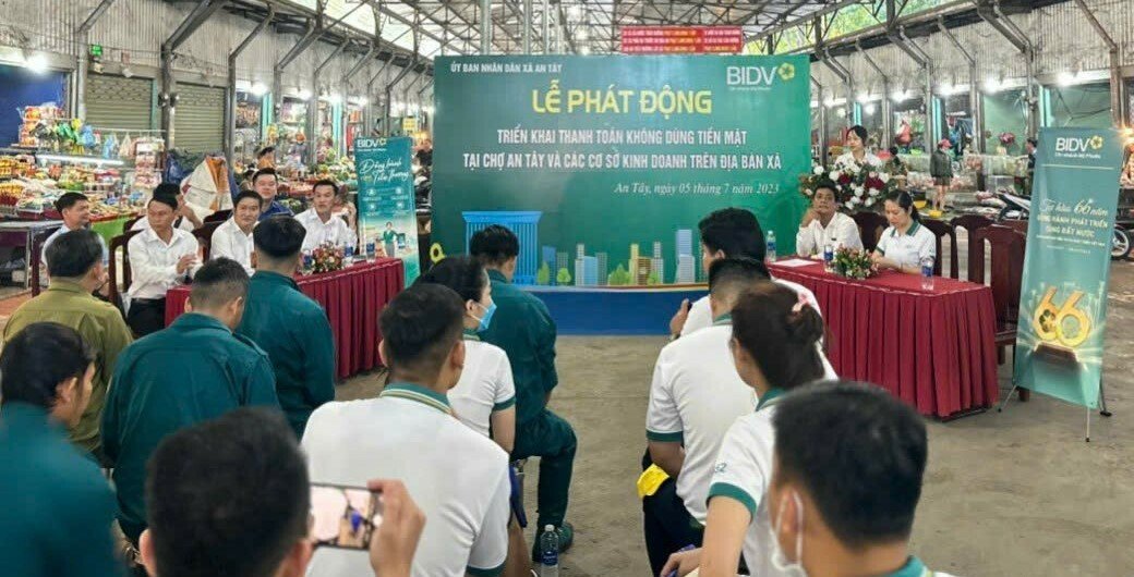 Sau lễ phát động, Ngân hàng BIDV - chi nhánh Mỹ Phước phối hợp lực lượng đoàn viên thanh niên tuyên truyền, hỗ trợ người dân, tiểu thương trải nghiệm thanh toán không dùng tiền mặt tại chợ An Tây.