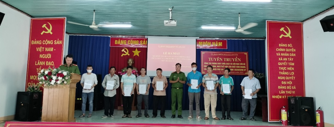 Tại lễ ra mắt, UBND xã An Tây đã trao quyết định thành lập 04 tổ liên gia an toàn PCCC trên địa bàn 04 ấp, mỗi tổ liên gia gồm 10 hộ gia đình, nhà ở kết hợp với sản xuất, kinh doanh liền kề nhau. Theo đó, các hộ gia đình phải thực hiện tốt các điều kiện về an toàn PCCC và cứu nạn cứu hộ (CNCH), chuẩn bị sẵn sàng phương án thoát nạn khi có sự cố cháy, nổ xảy ra; nắm được các kỹ năng về PCCC, CNCH. Mỗi hộ gia đình trong tổ liên gia liên kết với nhau phải trang bị ít nhất 01 bình chữa cháy và 01 dụng cụ phá dỡ, lắp đặt 01 chuông báo cháy và nút ấn báo cháy ở vị trí phù hợp.